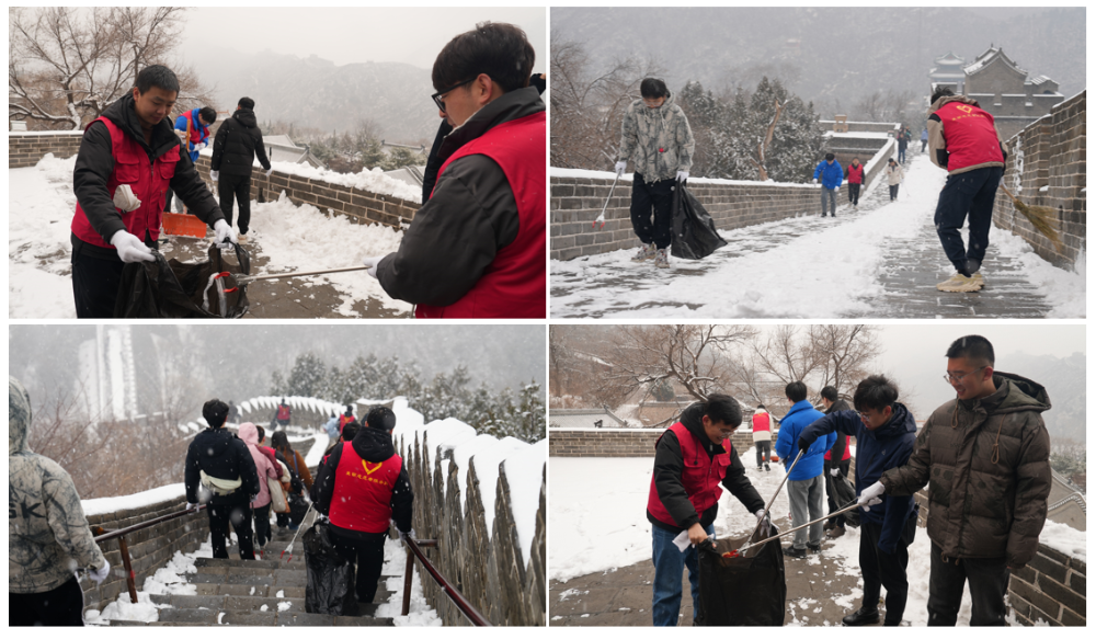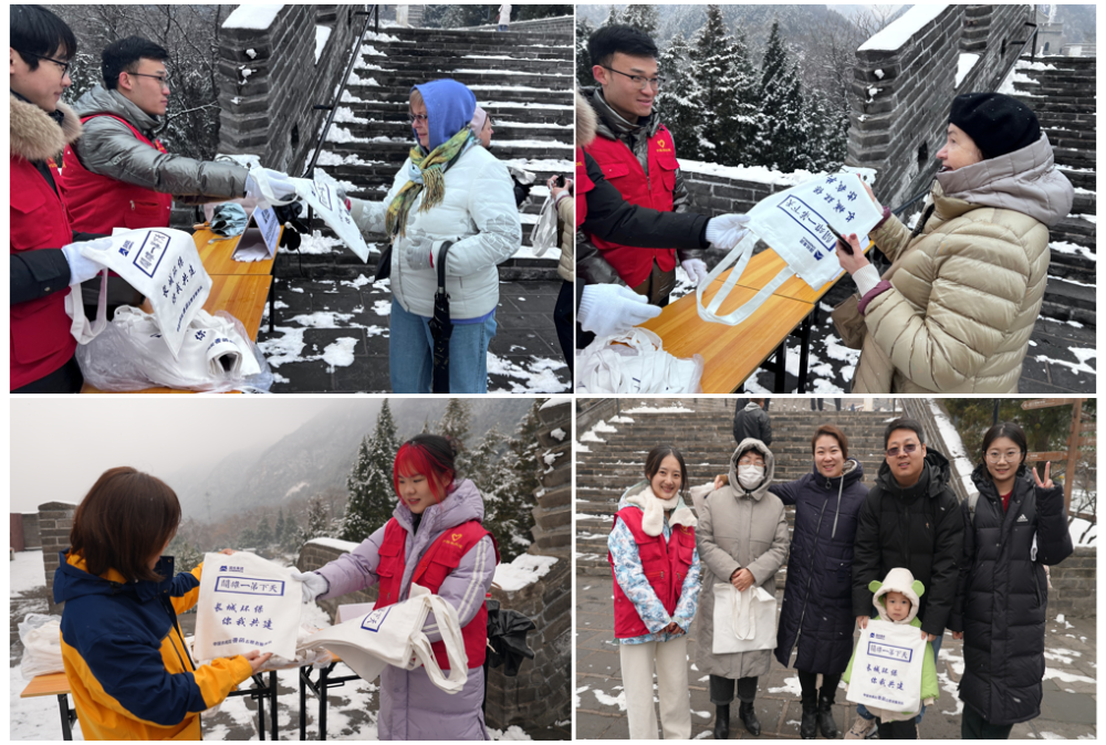 志愿者们被分为三组,分别承担起不同的任务。一部分人手持垃圾袋与垃圾夹等清洁工具,沿着长城曲折蜿蜒的线路行进,细致地清理沿途遗弃的垃圾;另一部分志愿者则通过向游客分发环保布包,积极传播环保理念和知识,倡导绿色文明旅游行为;还有一部分志愿者在风雪中挥洒汗水,清扫长城上的积雪,以确保游客能够安全地攀登这一世界文化遗产。他们用实实在在的行动践行了雷锋精神,为保护长城、维护环境贡献出自己的力量。
