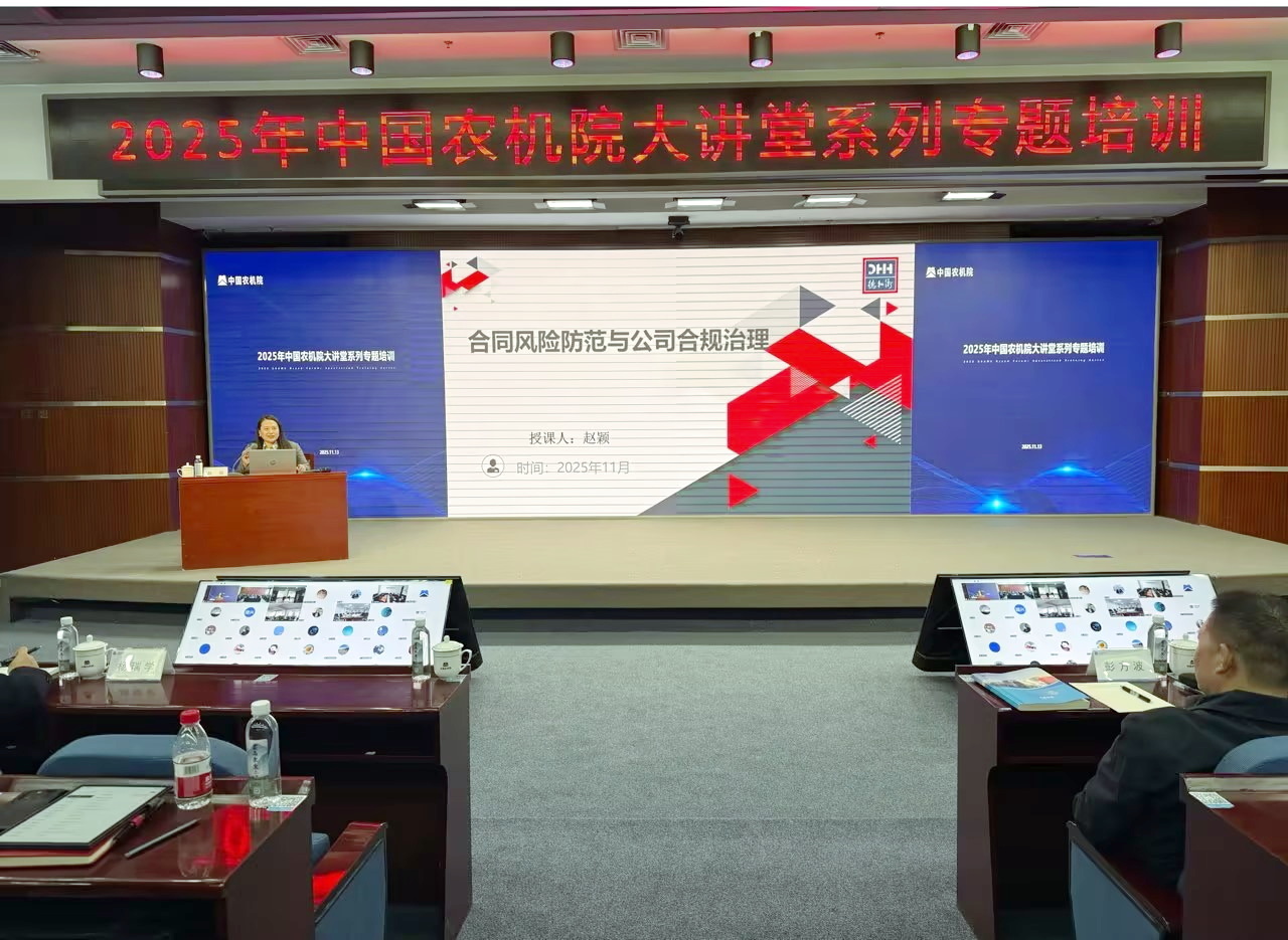 为深入贯彻落实我院高质量发展战略部署,推动精益管理走深走实,全面提升全员依法治企能力与风险防范水平,2025年11月13日下午,中国农机院大讲堂开展“合同风险防控和公司合规治理”专题培训,特邀北京德和衡律师事务所副总裁、国资国企领域知名法律专家赵颖律师授课。