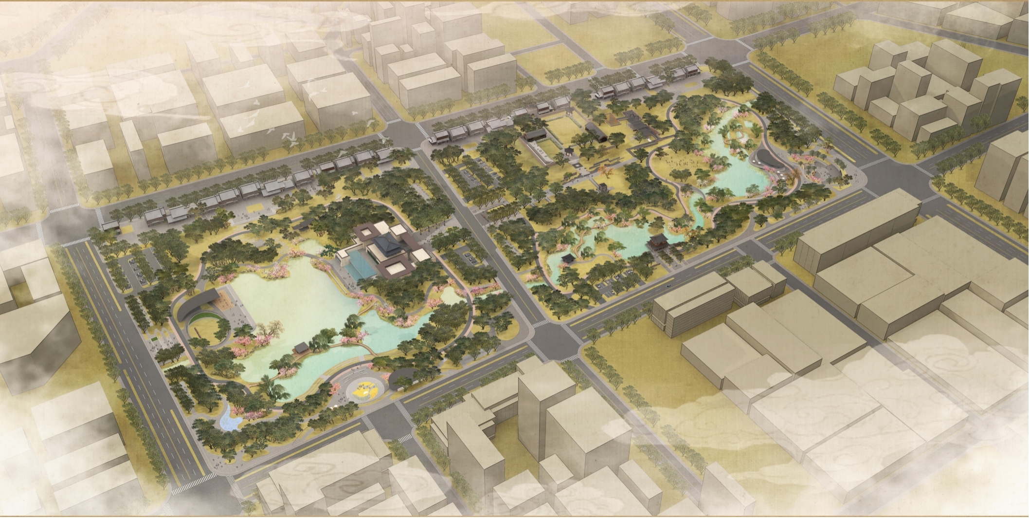 本项目依托“以画境入景、以文脉筑园”的概念,通过“园中城+城中园”的模式,意将城东文创片区打造成雄州“文旅新名片”,联动片区基础设施建设、住房保障体系建设、公园体系建设及城市公共服务设施建设,打造雄县“历史文化展示窗口、城市生活圈未来样板”。项目作为雄县城东文创综合片区重要节点,兼具文化、生态、景观、旅游等功能,项目团队以前瞻性思维,采用“山水探源、文物新生、古今创享”的策略,拟将本项目打造成彰显燕赵山水风骨、活化地道遗产利用的考古文化旅游区。