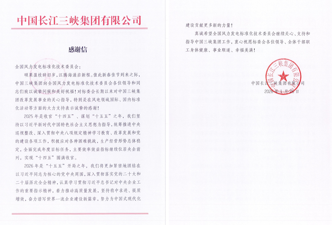近日,全国风力发电标准化技术委员会(以下简称“全国风标委”)收到来自中国长江三峡集团有限公司的感谢信,对全国风标委长期以来在风电领域国际、国内标准化活动等方面的支持表示感谢,充分肯定了双方深度合作所取得的丰硕成果。