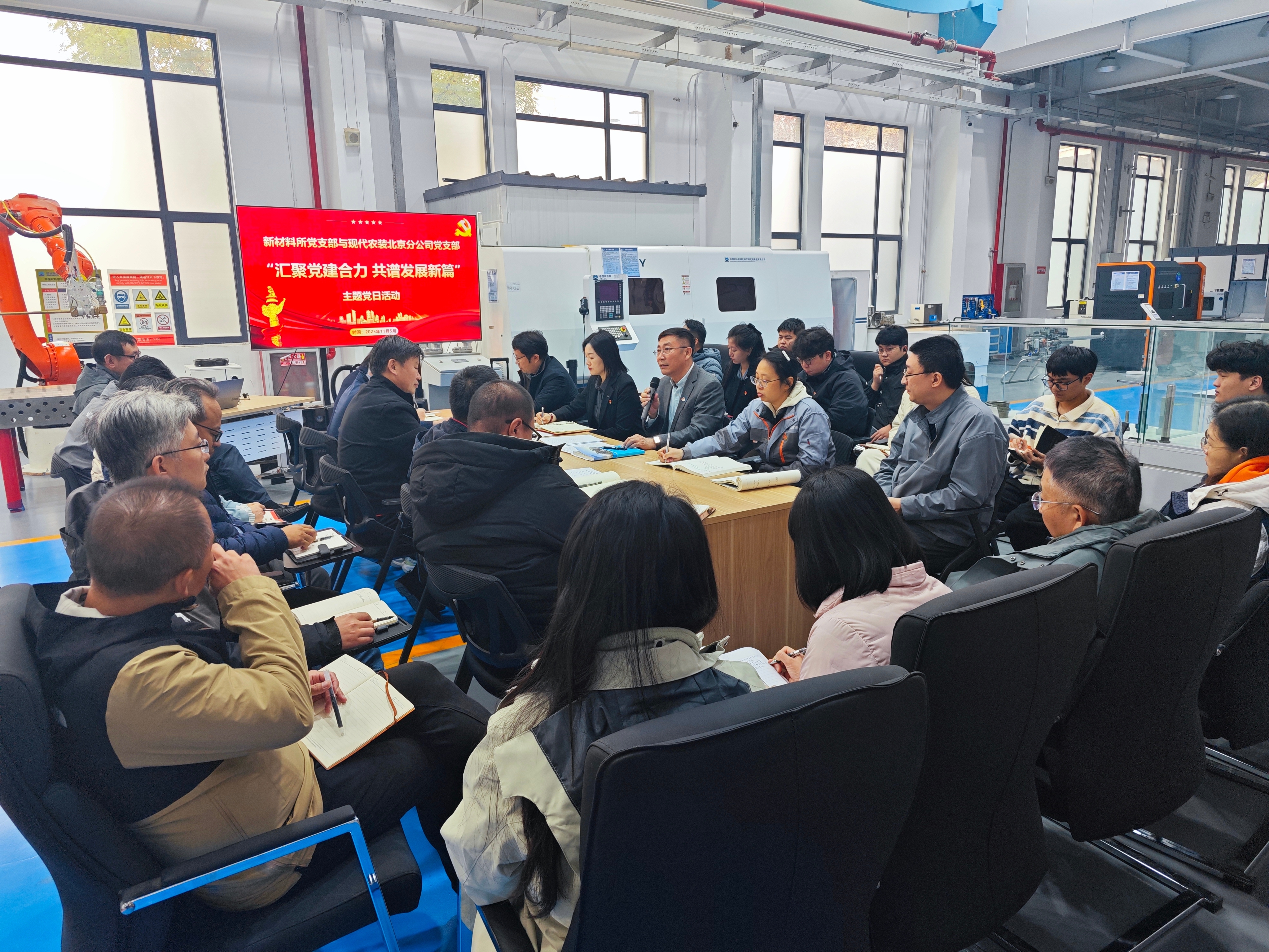 2025年11月5日,为深入贯彻党的二十届四中全会精神,新材料所党支部和现代农装北京分公司党支部在新材料所生产实验室现场组织开展了以“汇聚党建合力 共谱发展新篇”为主题的主题党日活动,20余名党员业务骨干参加活动。