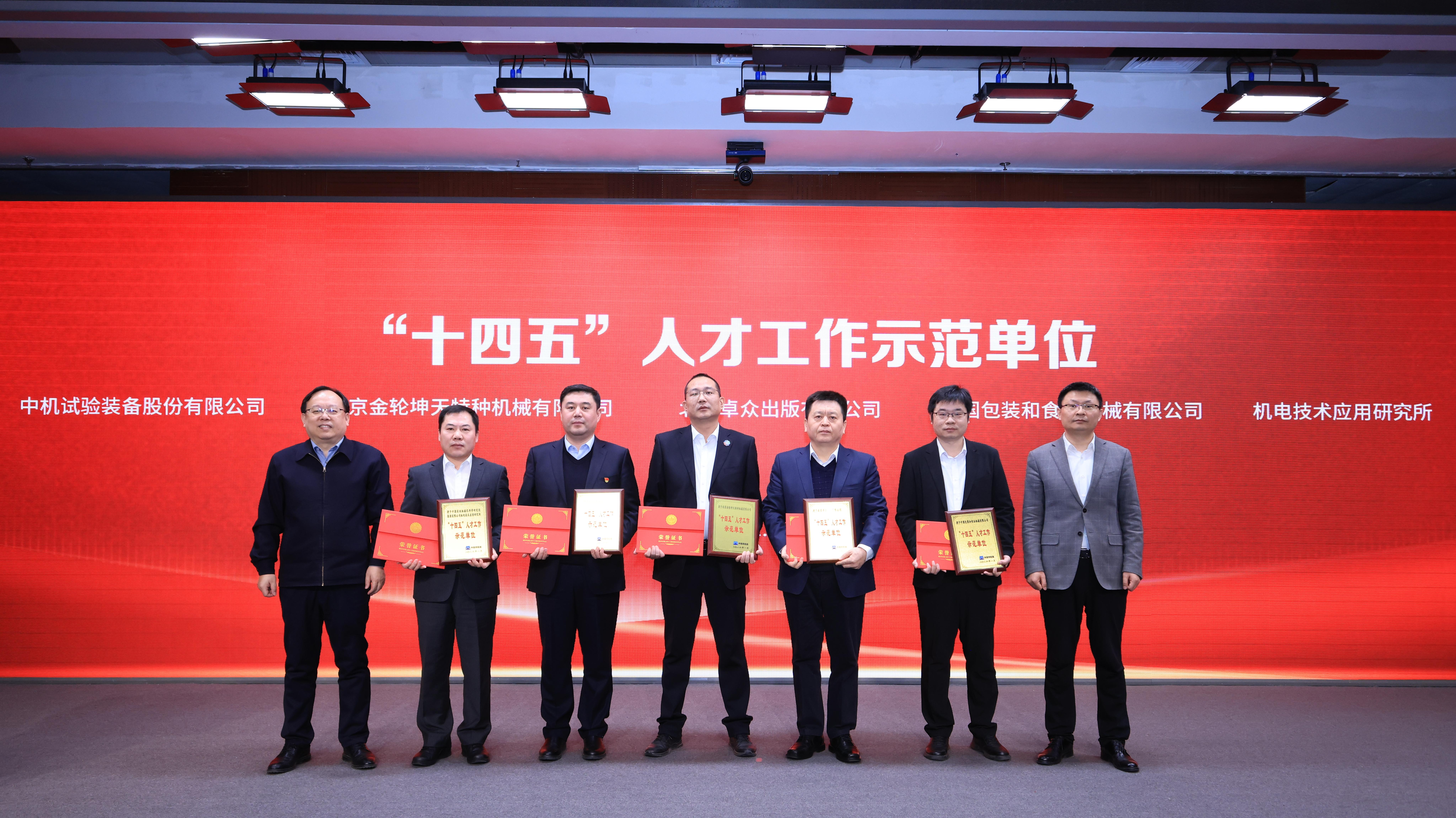 会议对“十四五”期间人才工作表现突出的集体和个人进行了隆重表彰。汪瑞军等5名专家荣获“扬帆计划”领航人才年度考核优秀奖,中机试验、金轮坤天等5家单位荣获“十四五”人才工作示范单位称号。获奖专家代表杨德秋及5家示范单位主要负责人分别在现场交流发言。